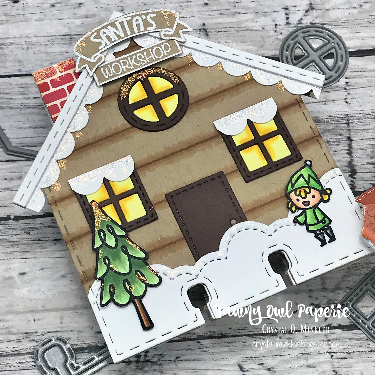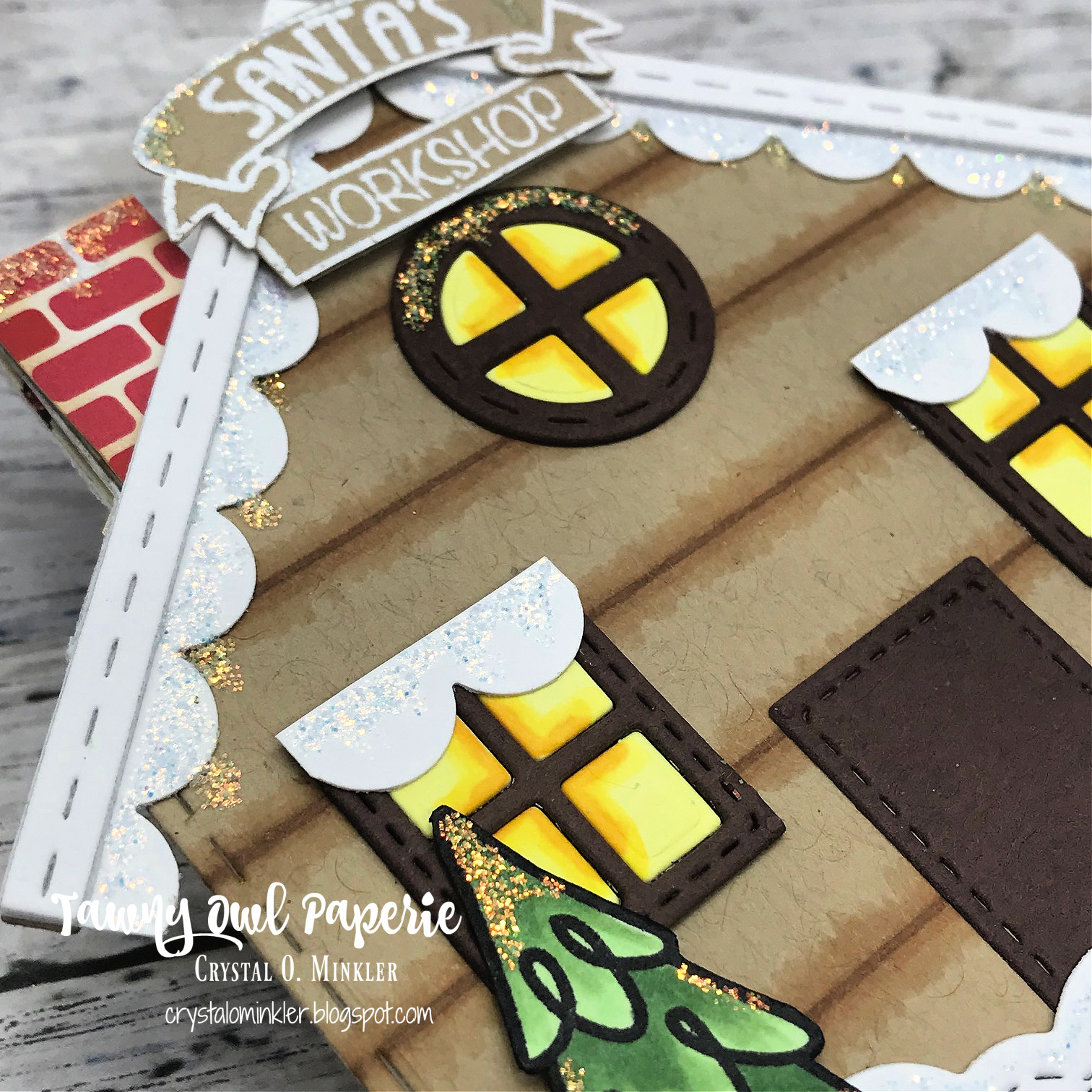 See all that fun glittery goodness?! It's so pretty in person. I used a ruler and a couple of Copic markers to create a "log cabin" design for the building. The cute little chimney is a piece of pattern paper. I stamped the Santa's Workshop sign with clear embossing ink and melted some white embossing powder. I then trimmed the signs and adhered them to the front of the building. Here's a list of the Copic markers I used for the front of this card: