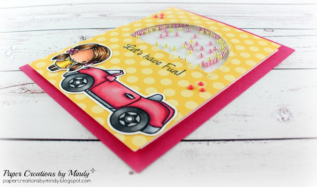 Happy Hello! It’s Mindy from Paper Creations by Mindy and I’m thrilled to be sharing my card as Guest DT at the Greeting Farm again today!! Their stamps are just so cute ! This one is using Mega-Mini Go Time set which was a new release last month. I’m also playing along with their shaker challenge for the month of July.