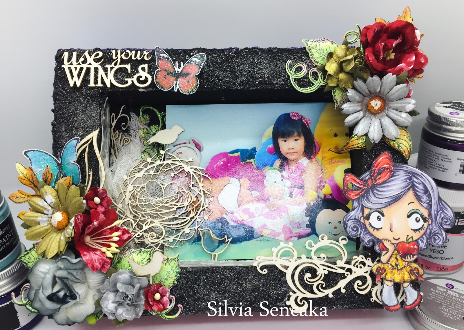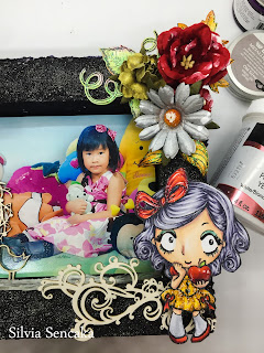 Here is after I arrange all the embellishment. I am making mix media shadow box with my daughter's picture in it ^^