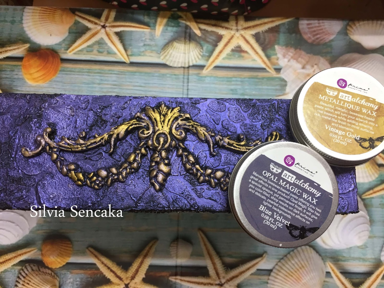 After the black gesso is dry, I add brick stencil in it, to add texture around box sides. Also added my handmade clay. Apply black gesso on it to. After, I apply blue velvet wax on the box, and the golden wax on the clay. You can see how shiny the waxes are!