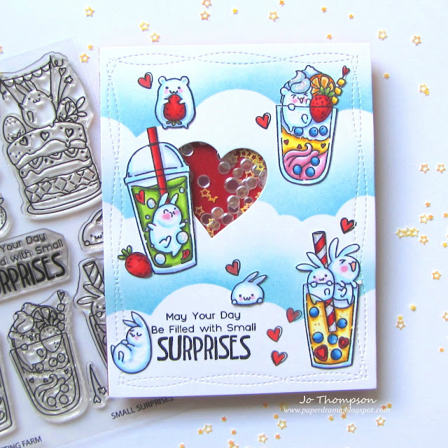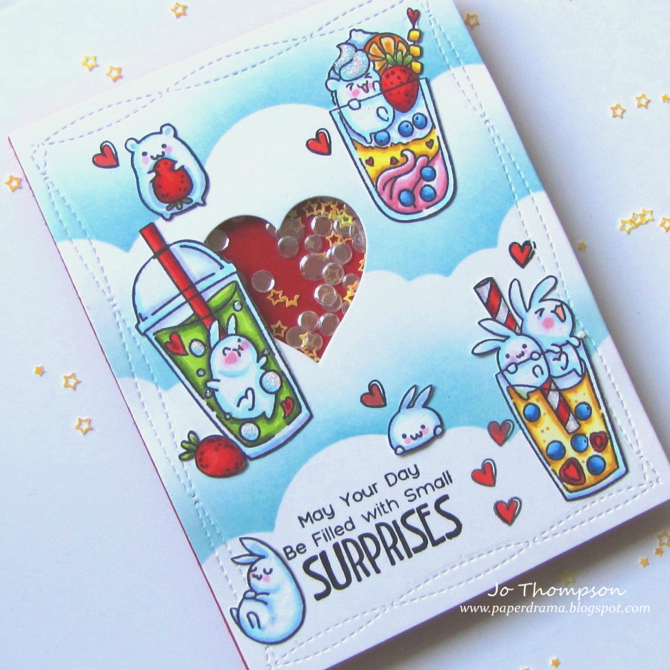 This stamp set is so adorable! I used most of the images included in the stamp set. All images are colored with Copic markers. I added some Star Dust Stickles on each of the cup images for a little sparkle. The cloud background was created with a makeshift cloud stencil using several cloud border dies. I used Distress Oxide Ink in Broken China. The little heart shaker portion of the card was cut out using a heart die that I had on hand.