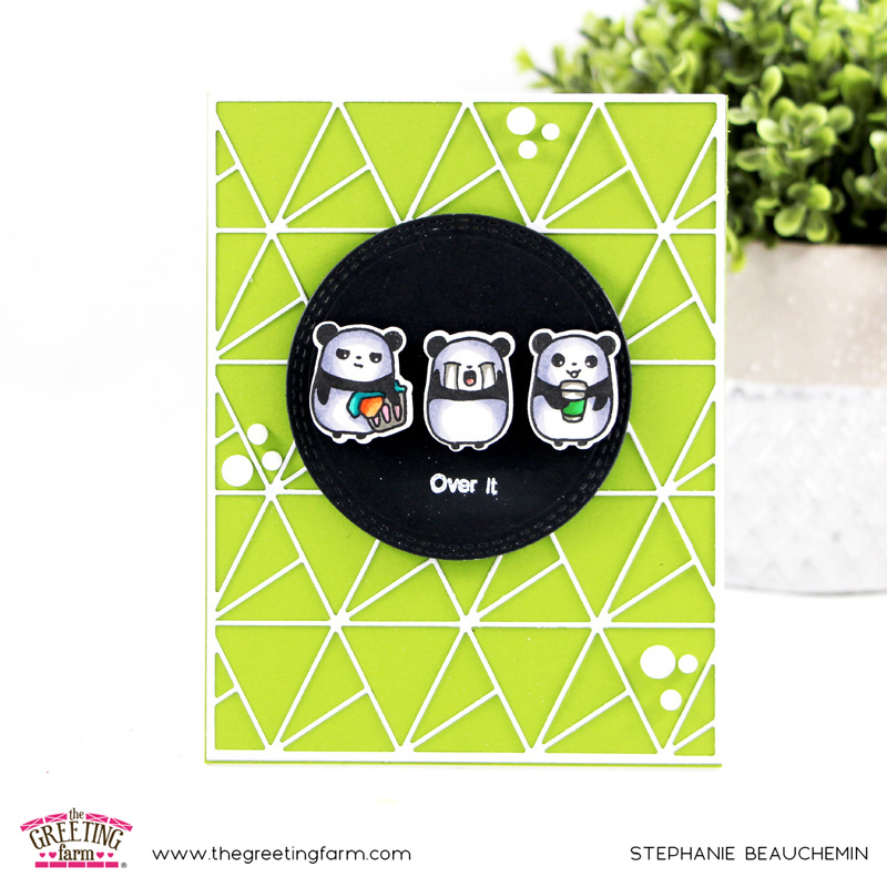 Today's card features the super-duper adorable Panda Plans stamp set and its coordinating die. I can't help but adore how their expressions totally make me relate to them, hehe! As always, I really like turning the tiny planner sets into cardmaking projects, so I created a simple A2 cardbase made of green cardstock. Then, I added a diecut panel and a black circle diecut to pop my three little pandas on. The card wouldn't be complete without a sentiment, so I clearly had a laugh and heat embossed "Over it." hehe!
