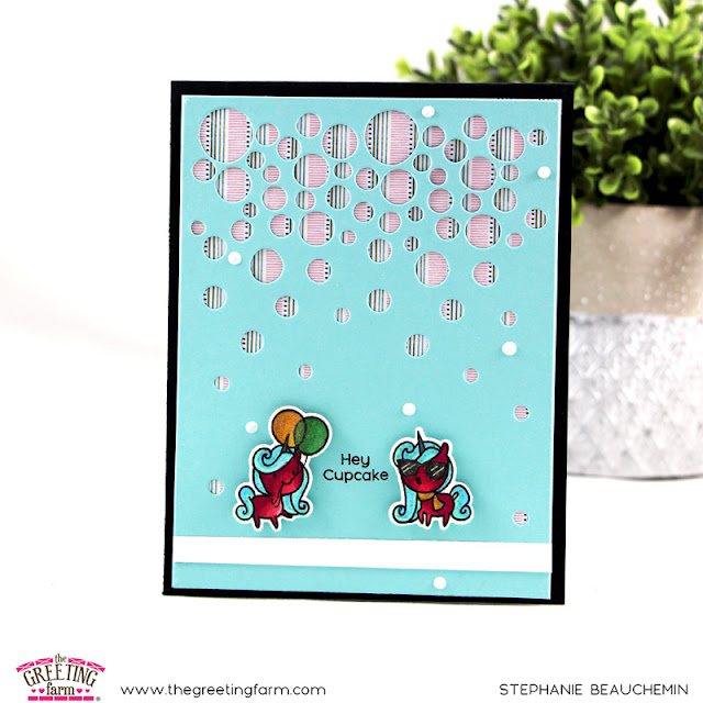To create this card, I started with an A2 black cardbase, to which I added two layers of patterned papers; with one being a see-through panel, you could get a glimpse of the second sheet without it "crowding" the project. I added the little unicorns with foam tabs directly onto the diecut panel, but not before stamping a sentiment from the set. Isn't this saying adorable?!